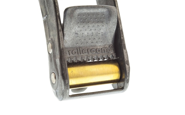 独自設計の真鍮製ローラー付きカムバックルを採用し、