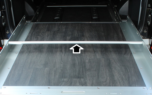 アルミスライドフロアの先端部に装着されているラゲッジストッパーは